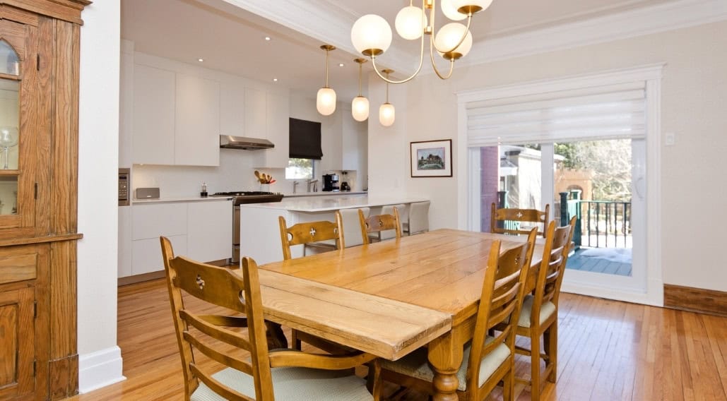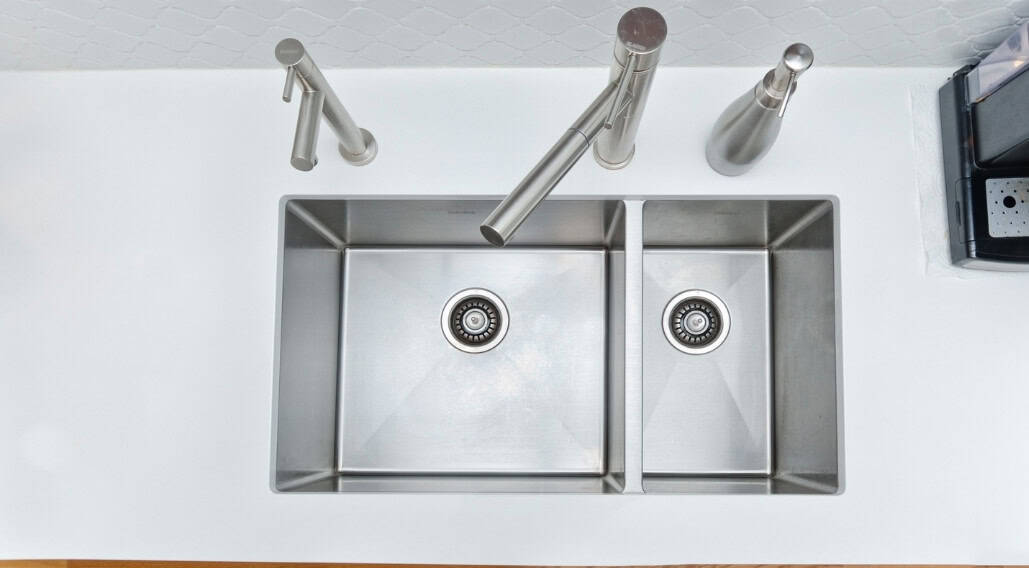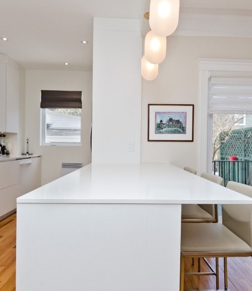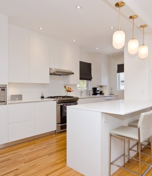 Cuisine blanc ultra élégante. Les armoires italiennes sans poignées, les comptoirs de quartz blanc et le dosseret arabesque créent une apparence simple et minimaliste qui s’harmonise sans souci avec les sections les plus traditionnelles de la maison.